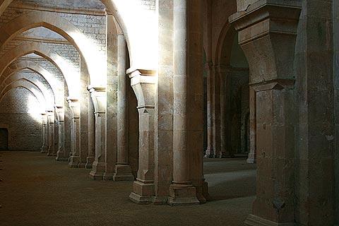 The Abbey church is large, calm, and constructed in the local white-pink stone, with the sturdy columns creating a large number of arches.