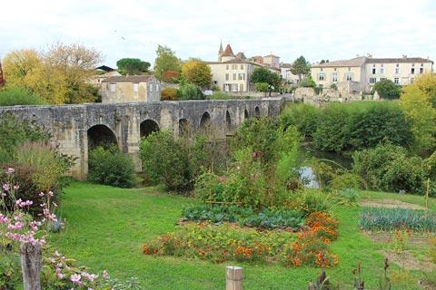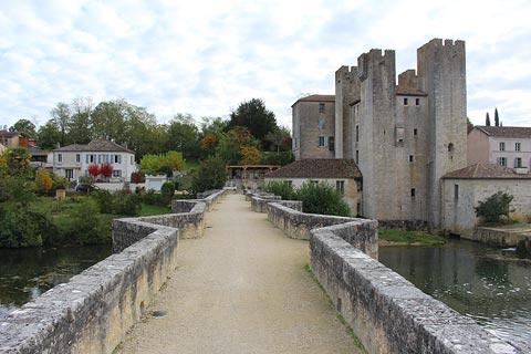 The scenic village of Poudenas has a bridge across the small river and a castle with large gardens to visit