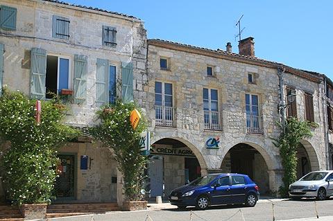 Perched on a hill top overlooking the lovely Agenais countryside, the main square in Beauville, the Place Archambault-de-Vençay, has the town hall on one side and lovely arcaded stone buildings on the other three sides.