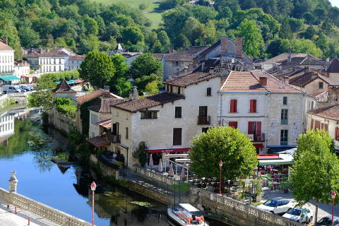 The town is known locally as the Venice of Perigord. Wooded cliffs loom up behind the beautiful Benedictine abbey and the river Dronne runs around the village in front of a Benedictine Abbey with a small weir and a lovely and unusual right-angled stone bridge to add to the beauty of the scene.