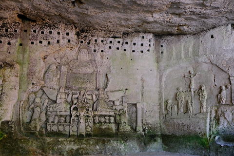 Behind the abbey at the foot of the cliff are the troglodyte dwellings used by the original monks and in here is the cave with the remarkable sculpture of ‘The Last Judgement’.
