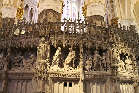 The decorative stonework of Chartres cathedral also continues inside, while the decoratively carved wooden screen around the choir is another notable highlight: it is an extraordinary work, carved in the 16th century and including about 200 individual statues!