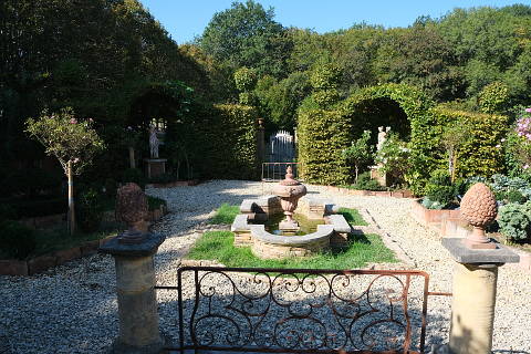 The focus of the garden is a lovely Baroque fountain and there are various statues. The old stable building is also near here and is surrounded by parterres of roses and espaliered apple trees.