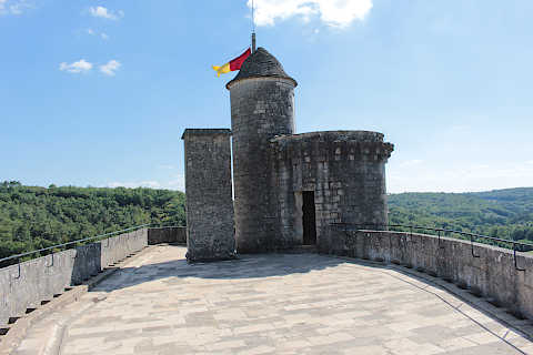Towards the end of the visit you reach the main building, the castle keep of the Chateau de Bonaguil. There are a few rooms in the keep that show examples of period dress costumes but the highlight is certainly the top of the building where a large terrace has exceptional views of the other buildings in the castle as well as the village of Bonaguil and the forested hills around the castle.