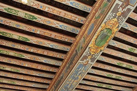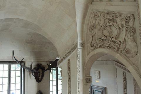 As soon as you enter you can see the beautiful painting of the wooden panels representing Don Quixote in the dining room, and a lovely painted ceiling. Next you reach the stairs which you will notice are straight rather than a spiral staircase. The staircase has some very ornately decorated stonework and you can also a 16th century suit of armour and some prehistoric antlers discovered in Siberia!