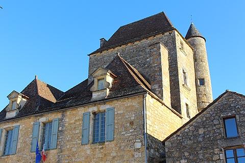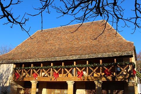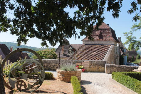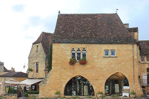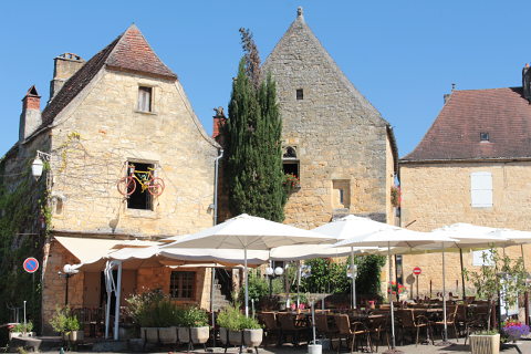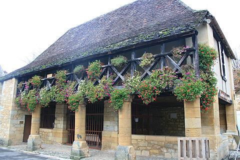 As you walk along the street you can also stroll into the small streets to either side where you will see more of the attractive cottages and their gardens. At the top of the hill you reach a large open area with several cafes, and the entrance to Domme caves. The original open market hall, with impressive carpentry and stone supporting pillars, is in this square and overlooked by the imposing 15th century 'Hotel du Gouverneur'.