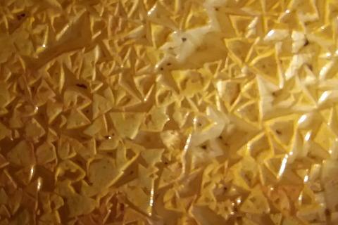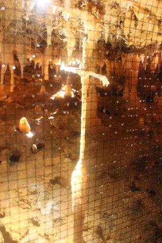 As well as the exentriques another unusual feature in the cave are areas where the floor has solidified with a pattern of triangles. Most unusual! There are a couple of particular cristalisations to look out for. One is a tall slender cross, hard to imagine the dripping rock forming such a simple yet gravity defying shape!