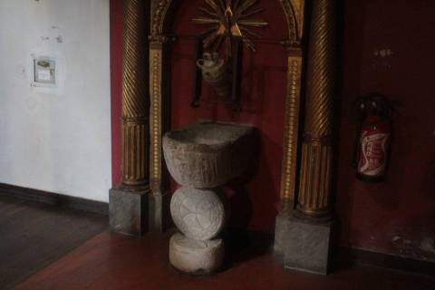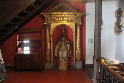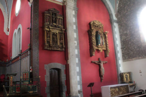 Inside the church, the wallls near the altar have been painted bright red, which makes an interesting background to the statues and artworks, which at this end of the church are mostly in gold frames. The altar is also red and gold, and includes a 16th century statue of the Virgin.