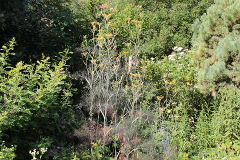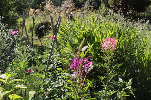 On the other side of the lawn is the vegetable garden but this has been planted in a style that is both attractive and productive. Vegetables suited to the harsh conditions have been chosen and these are often ancient varieties. Flowers are planted amongst the vegetables to attract beneficial insects and stakes and supports made from branches from the garden add to the attractive look of the garden.