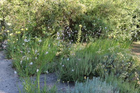 Beyond here is a small stone cottage which is rented out to guests and a long border in the style of an English garden. This border is filled with plants which like dry conditions such as lavender, achilleas, fennel, artemesia and evening primrose flowers.