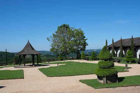 After passing through a more wild area of flowers and grasses you reach the Jardin des Sources et le Verger with a small pond and rows of trees, leading to a viewpoint across the surrounding Dordogne countryside.