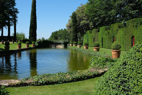 The Jardin Blanc is a beautiful area of the gardens of Eyrignac with rows of white roses planted between small hedges, and a large ornamental pond in the centre. This area is square, divided in four parts by alleys that form a cross and with a small pond in the centre of each quarter. In the centre of the edges of the square there are benches surrounded by plants.