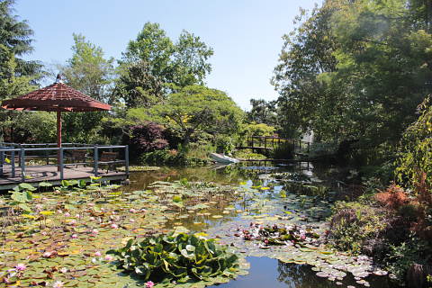 Initially when you enter there is a Japanese garden, a patio and a woodland area. This leads to one of the highlights of the garden which is a walkway over the large pond packed with different coloured water lilies and with lotus plants.