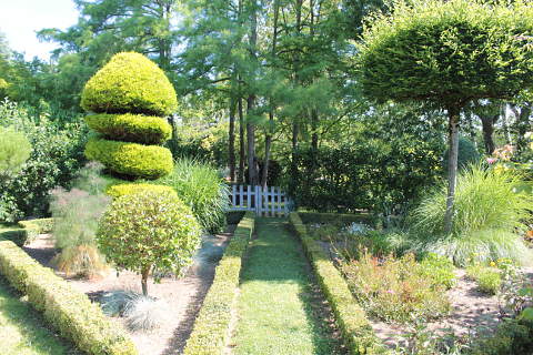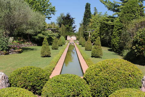 One of the most dramatic parts of the garden is the Mediterranear garden with its long water rill and double rows of both Italian cypress trees and conical shaped topiaries. Large box balls decorate one end a decorative wall is at the other end.