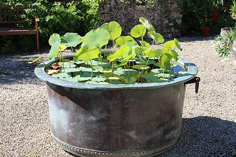 The courtyard itself is large and covered with various plants in barrels as well as a large planter filled with lotus plants. From the edge of the courtyard are some excellent views down over the garden below.