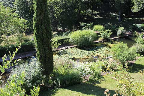A huge rectangular pool filled with water-lilies and Koi-carp and edged with arum lilies and a number of shrubs which overhang and whose branches touch the water it is lovely. When the fountains are turned on it is sensational.