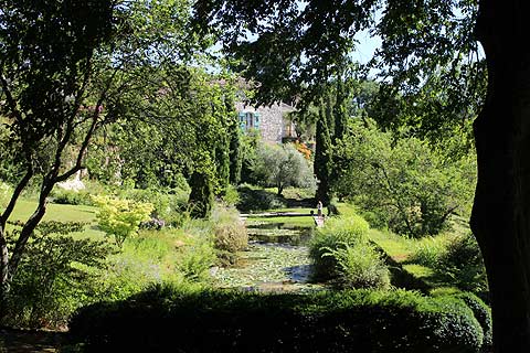 On entering the Jardins de Sardy you first enter a pretty courtyard surrounded by various buildings of the Sardy estate. These pretty buildings of pale stone with terracotta roofs and pale blue shutters surround three sides of the courtyard whilst the fourth draws you towards views of the garden below.