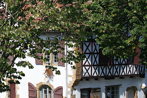 La Bastide Clairence is a bastide town with a definite Basque flavour. The houses are painted white and all have shutters painted in the deep red colour, or occasionally in green, both colours typical of the shutters in the region.