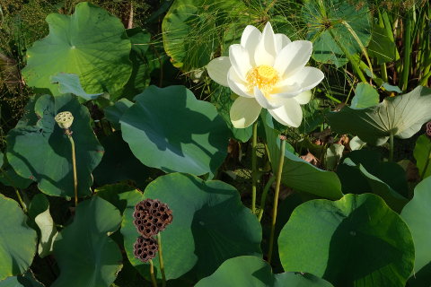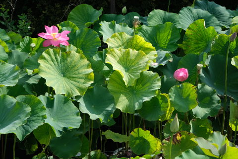 Along the side of the waterlily ponds are the lotus ponds. With their beautiful flowers of white and many shades of pink and their sculptural seedheads these are lovely to see. Their main flowering time is July and August.