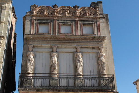A small square opposite the halle has a modern water feature and further down the high street is a beautiful house called the 'House of the Caryatids' with four statues behind a wrought-iron balcony and an ornate roof line. Caryatid is the name for a female statue without arms. This neo-classical building was built in 1830 by an ancient mayor of Lauzun who clearly had illusions of grandeur!