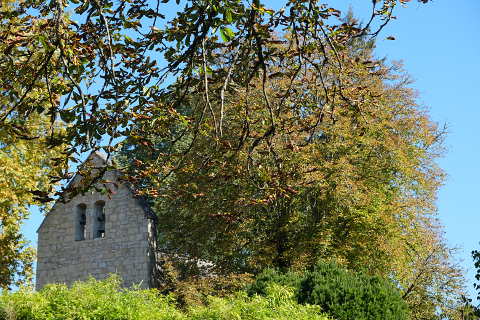 The church has a flat bell tower which are unusual but there are a number in the Perigord region of France. At the bottom of the belltower-wall is a funeral niche.