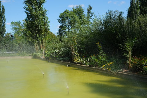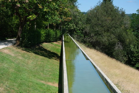 The path leads upwards to a kind of outdoor theatre with views over the glass roof of the greenhouses as well as glimpses of the town of Terrasson below. The greenhouse has a flat roof to evoke a mirror of water.
