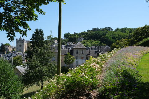 The path then leads to a more open section of hillside with wide flower beds of mostly blue flowers with reflect the blue/grey of the slate rooves of Terrasson and the views of the town from here are stunning .
