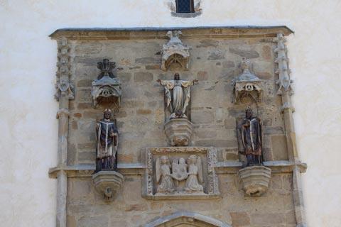 Admire the stone carving and statues around and above the doorway, then enter the church to see the remarkable stalls and wooden statues from the 16th century and the 19th century stained glass windows.