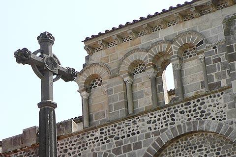 The rebuilding is in the gothic style using the very distinctive dark stone that you will see widely used in church construction in the Auvergne (the stone is known as the 'pierre de volvic'). The inset arches and the contrast between the dark stone and the light lime used between the stones give it a very decorative appearance.