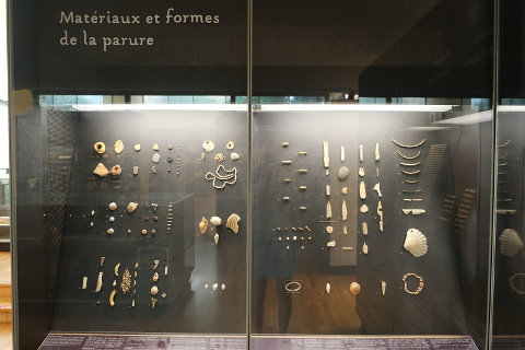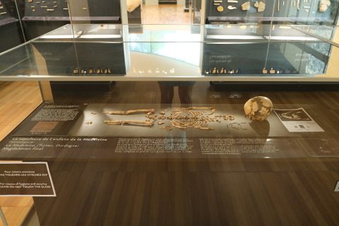 The upper gallery has articles related to art and rites and has a skeleton of a child from the nearby shelter at La Madeleine near to Tursac. This grave included lots of ornaments made from pierced teeth and shells.