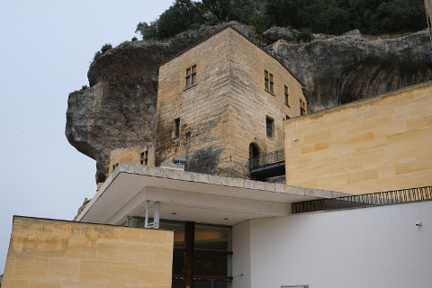 The National Prehistory Museum occupies a dramatic position underneath the steep cliff which overhangs the Dordogne village of Les Eyzies. Part of the museum is the castle built into the cliff along from which is the iconic statue of a neanderthal man that stands over the village.