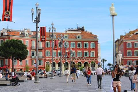 Start your visit (and recuperate from your shopping) in the extensive open square and gardens at the southern end of Rue Jean Medecin called Place Massena, a pedestrianised square with many grand buildings around its edges, many an attractive red colour with columns and arcades.
