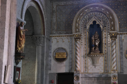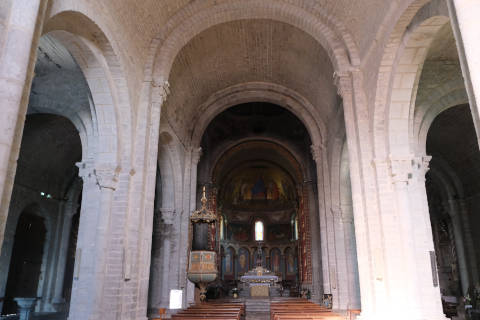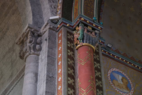 The painted capital stones on the pillars in the choir area of the church are one of the most remarkable sights in the church, and represent, for example, Saint-Jean the Baptist, the dance of Salomé, and musicians and dancers. The painting has been redone, adding vitality to the statues and reminding visitors of how churches really looked in the medieval period.