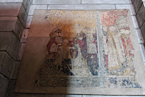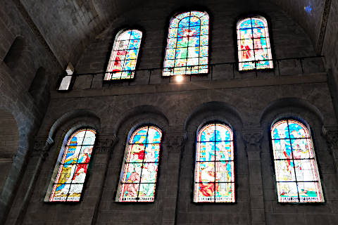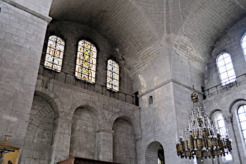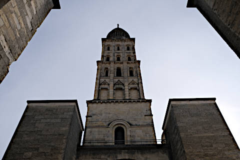 The oldest parts of the church are the current entrance to the cathedral and the part supporting the bell tower: these parts remain from a more simple church that was part of an abbey and largely destroyed by fire in 1120. The pillars in the corner of this entrance (parvis) were added in the 13th century, probably to support a dome that was never built. The square belltower above has three tiers pierced with arches that support a tall dome.