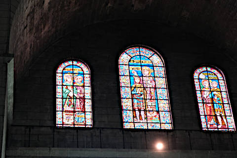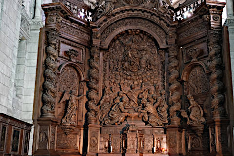The objects inside the cathedral are rather lost in the large and austere interior. Most of the interior furnishings are from the 17th century, and include the altarpiece, the stalls (that were brought here from Ligueux abbey) and the pulpit. There is also a second altar, in marble, that was made in the 18th century; several stained glass windows; and a large 19th century organ.