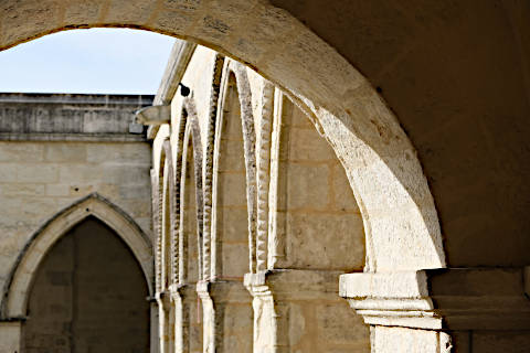 The 12th century cloister is to the right of the entrance of Perigueux cathedral and it is an attractive cloister that incorporates both roman and gothic style elements. I have been several times and never seen the gate to the cloister unlocked but you can get a reasonable view of the cloister from the parvis and from an opening in the front wall of the cathedral.