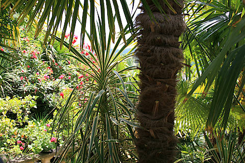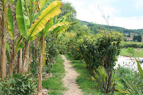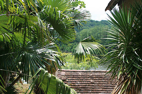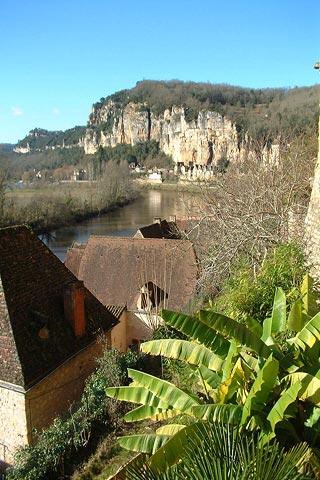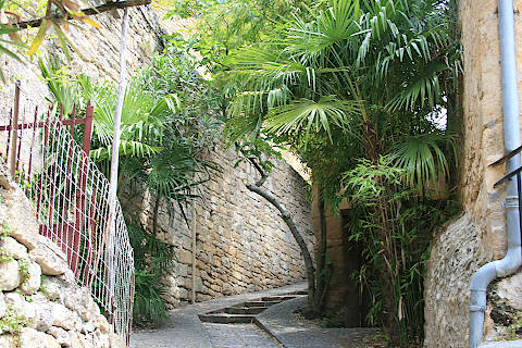 The narrow streets of La Roque-Gageac also pass through an interesting tropical garden as they climb up the hill below the cliffs. The palm trees and banana plants are able to grow here because the village is south facing and protected from north winds by the cliffs.