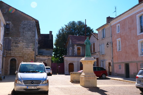The statue is in the square next to the Chapter House which is the most striking building in Saint-Astier. The corbeled turret of the Chapter House was once used as a meeting room.