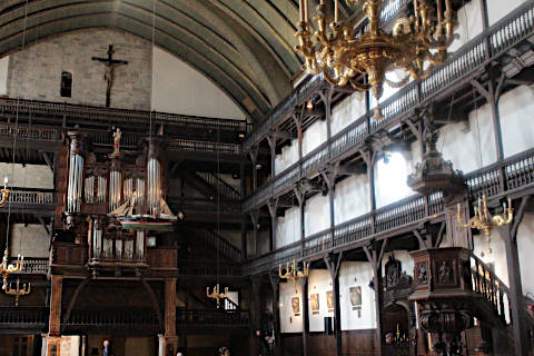 Although more modest in ambition than the altar, the tiered balconies are also very impressive and along both sides of the nave, with the highest level near the ceiling of the church. Historically, the men attending a service sat on the balconies and the women sat below in the body of the church.