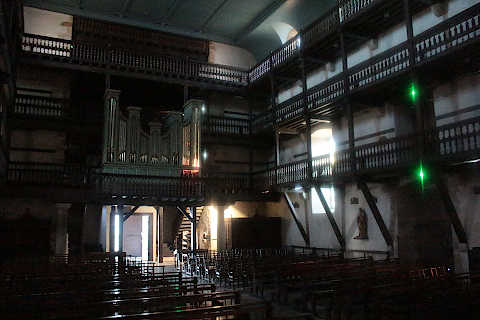 The church in Ainhoa is a traditional Basque church with rows of balconies around the walls