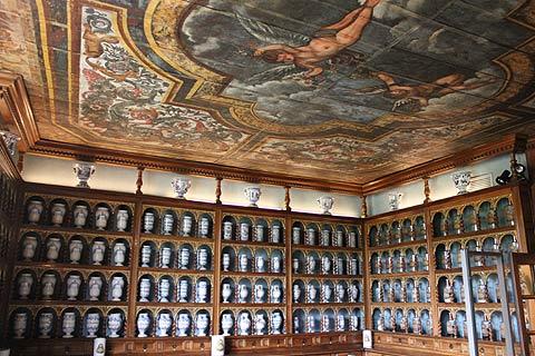 There is also a wonderful pharmacy with gleaming wood where glass cabinets hold rows and rows of blue and white earthenware pots, each for different herbs and medecines. The ceiling is painted with a scene of cherubs in the heavens. The pharmacy is one of the oldest in France.