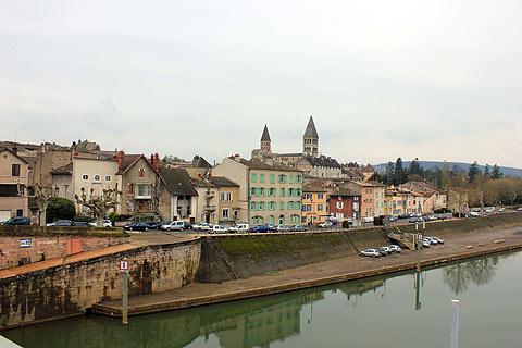 The town of Tournus is on the Saone River in the Saone-et-Loire department of southern Burgundy. the town has a history dating back to the romans, when the raised position above the river made the location easy to defend.