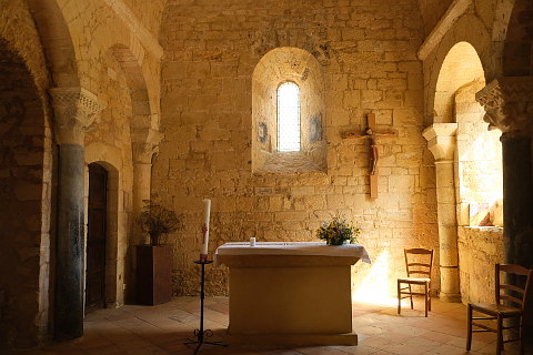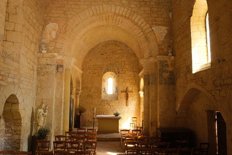 Inside the church are various arches supported by stone pillars and topped with decorated chapters. Two of the pillars are black marble and are thought to have been taken from a different building, perhaps a Gallo-Roman villa.